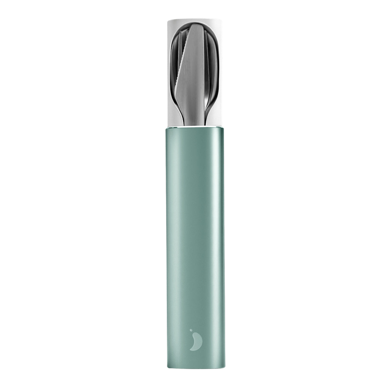 Chillys Cutlery Set Abyss in Lichen Green. a 4-piece full size cutlery set. Includes a stainless steel fork. sharp knife. spoon and telescopic straw. Dishwasher safe for easy clean up. Presented in a sleek aluminium case.