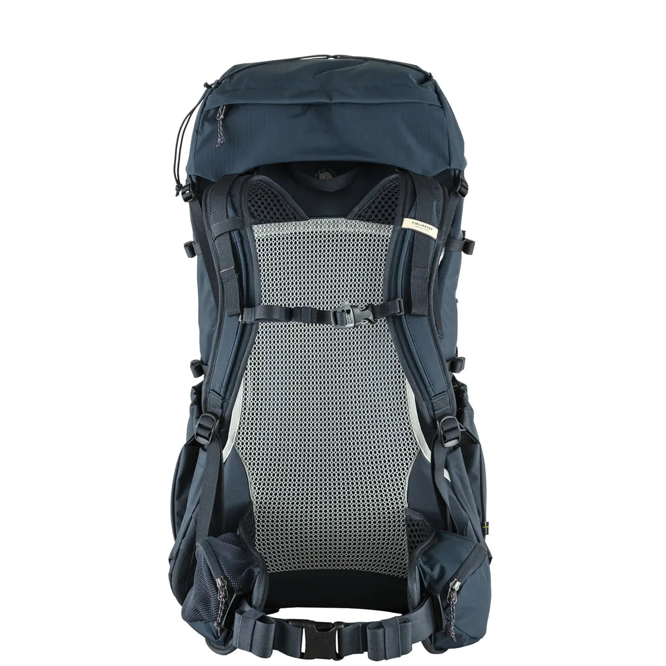 Lightweight. hardwearing backpack with fantastic ventilation and excellent carrying comfort – perfect for hiking in warm/humid climates. The carrying system is lightweight and stable with a fixed back length. ergonomic shoulder straps and a supportive hip belt with air mesh. The aluminium frame and mesh back panel let air circulate freely against the back. Now made of lightweight yet durable 210D nylon ripstop fabric with a reinforced base in 500D nylon. both 100% recycled. Volume: 35 litres.