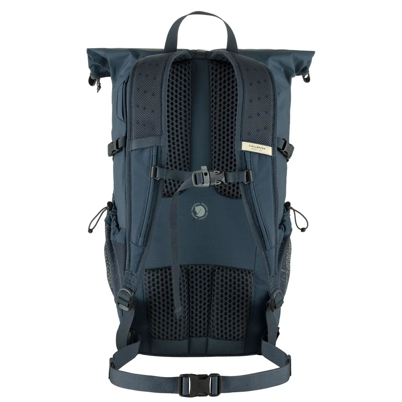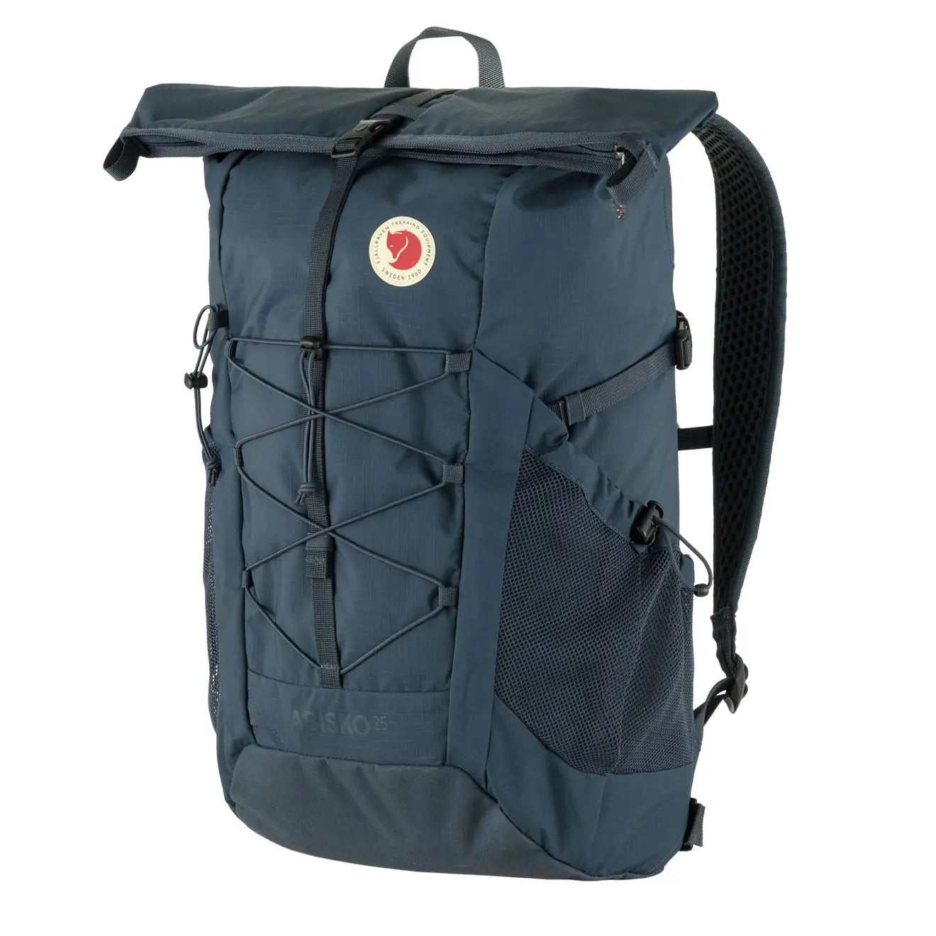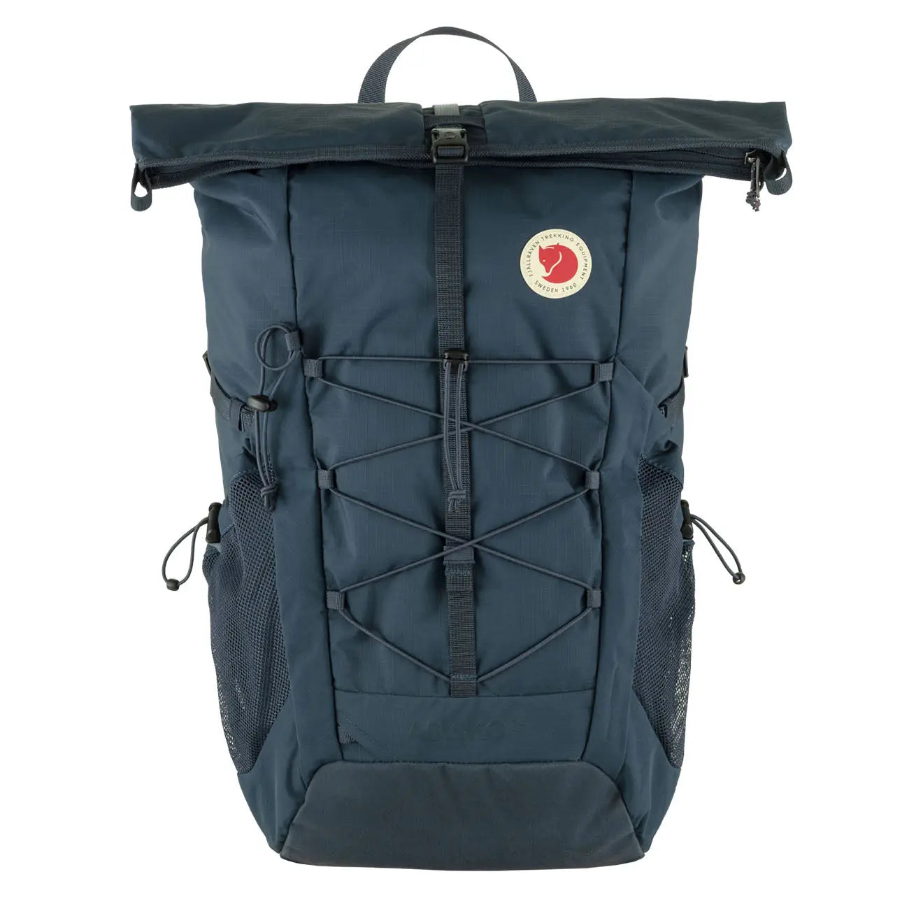 The Abisko Hike Foldsack is a versatile and lightweight 25L backpack. perfect for dayhikes and travelling. Made from 100% recycled nylon. this backpack has a fold-over. zippered closure that is secured with a plastic side release buckle. The fold-over closure is easy to use and can provide 4-5 liters of extra pack space or to secure a sleeping mat or other longer items. Zippered pocket hidden under the fold. Fixed back panel system with ventilating air mesh on the back and shoulder straps; the adjustable chest strap and hip strap are both removable. Sleeve pocket and zippered pocket inside and two oversized side pockets on the outside. Attachment on the front for a hiking pole or ice axe. Bungy cord on the front panel. If you’re looking for a highly functional backpack then look no further. Abisko Hike Foldsack has got all the functionality needed for everyday outdoor life.