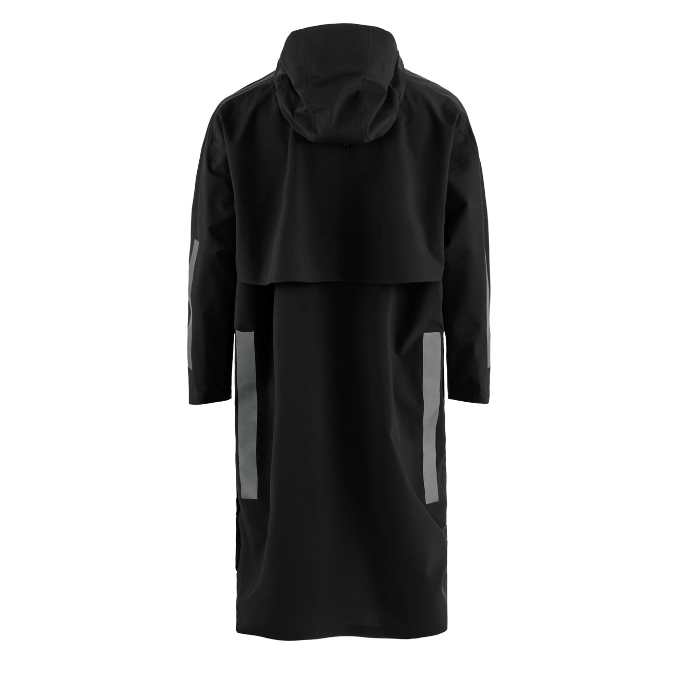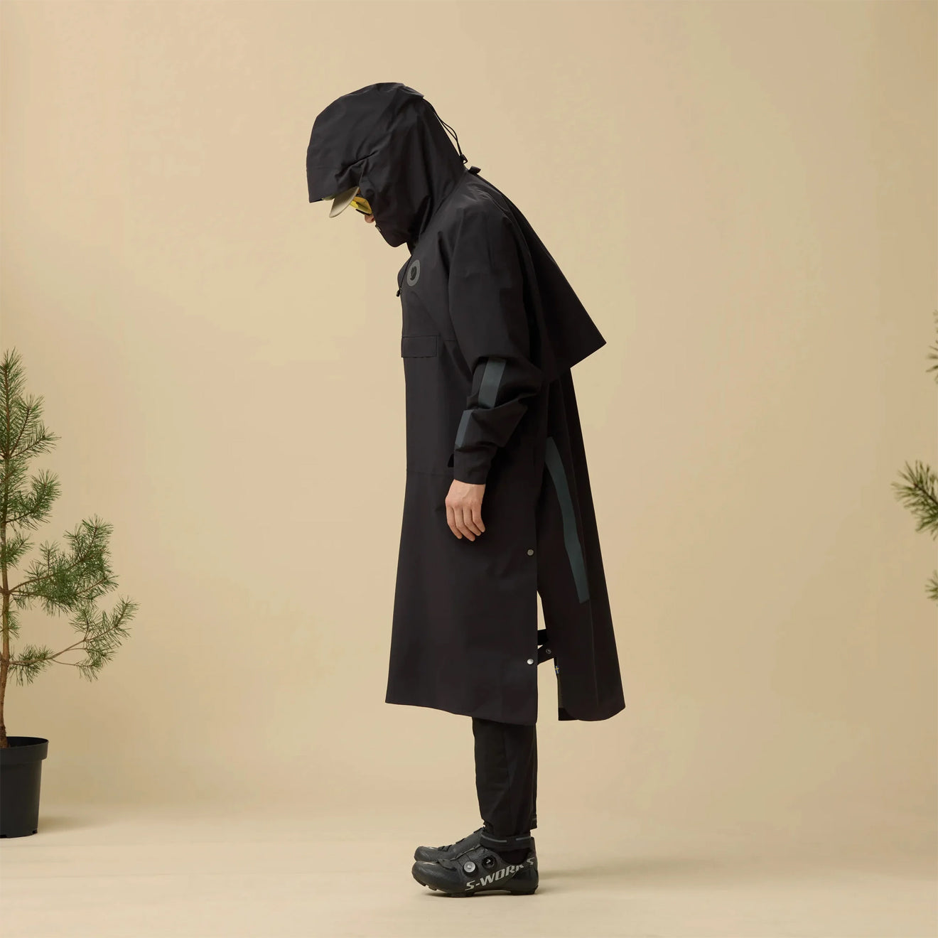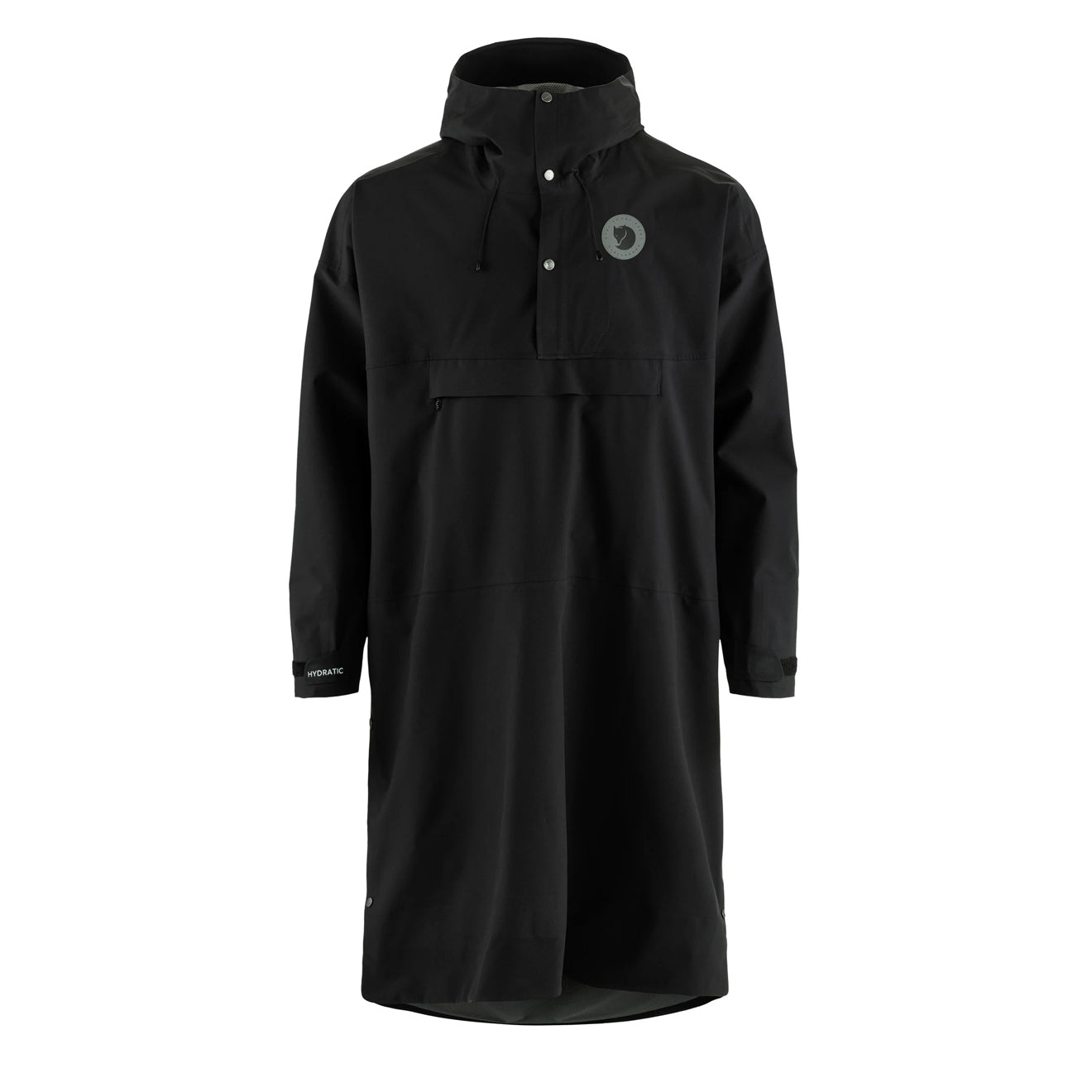 The Fjällräven Hoja Rain Poncho Black is a waterproof and breathable poncho designed for cycling in wet weather. Made for functionality and comfort. it features reflective details for enhanced visibility. a helmet-compatible hood. and extended cuffs for added protection. The elastic waistband reduces flapping during movement. while a large kangaroo pocket offers secure and convenient storage. Perfect for rainy commutes and outdoor rides. this poncho delivers reliable coverage and mobility in unpredictable conditions.