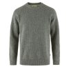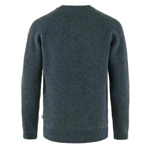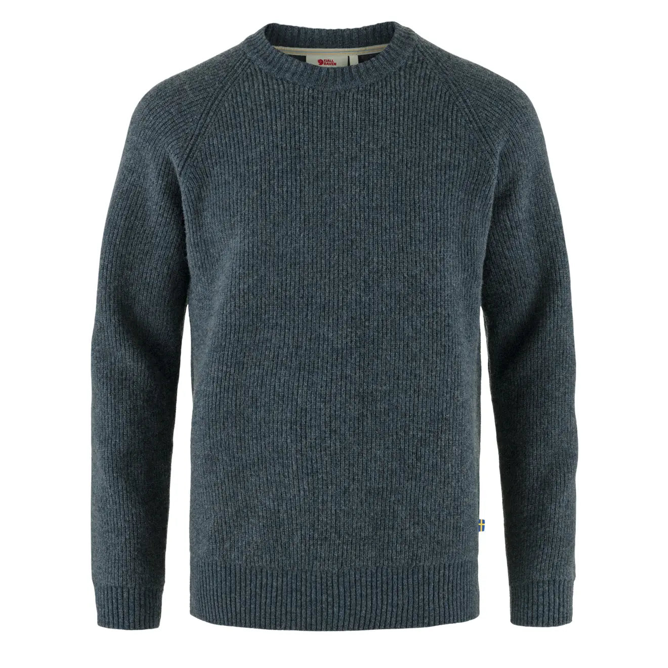 ?A classic round-neck sweater made from traceable wool. Knitted in a half-cardigan stitch for great insulation and raglan sleeves for comfort and freedom of movement. Ribbed neckline. cuffs and hem. Leather fox logo on sleeve. A fantastic timeless garment perfect to wear year round for everyday activities.