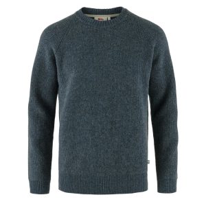 ?A classic round-neck sweater made from traceable wool. Knitted in a half-cardigan stitch for great insulation and raglan sleeves for comfort and freedom of movement. Ribbed neckline. cuffs and hem. Leather fox logo on sleeve. A fantastic timeless garment perfect to wear year round for everyday activities.