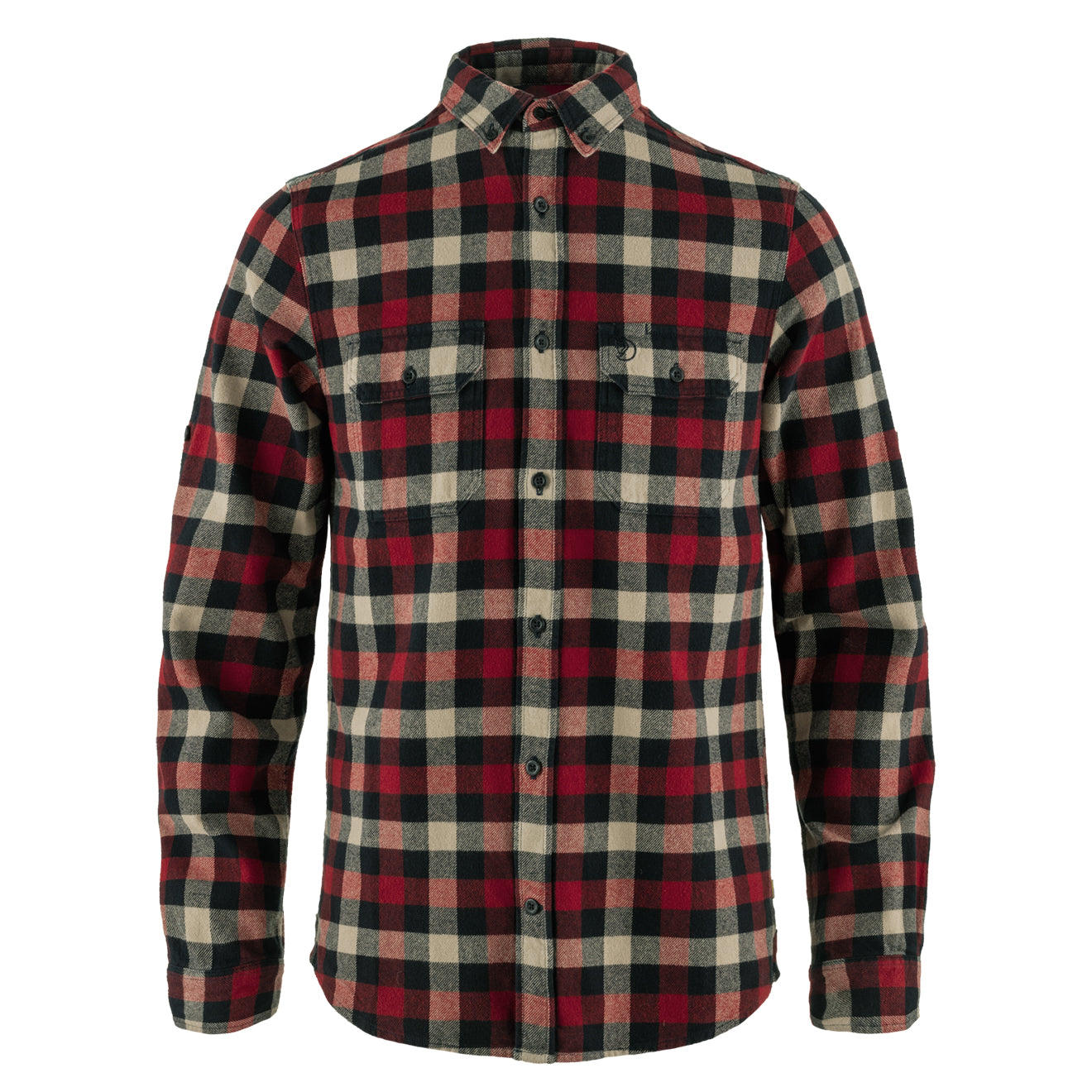 Fjallraven Skog Shirt in Dark Navy / Red. Long-sleeve everyday shirt with slim fit in wonderfully thick cotton flannel. Two breast pockets with flaps. buttons and pen pockets. Button-down collar and buttons to hold rolled-up sleeves in place.