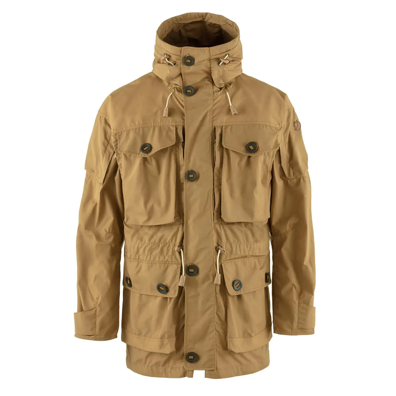 Durable outdoor jacket with many generous pockets that easily have room for the contents of a small backpack. Just like Jacket No. 68. it is designed for advanced outdoor life. all year around. but Smock No. 1 has a longer cut and a greater number of even more robust functions. The spacious hood can be adjusted so it fits the head perfectly and the visor can be folded to either provide maximum wind protection or more peripheral vision. When the hood is down it forms a high collar. Maps. first aid kits. smaller tools and other items needed for a day out in the forest can be stowed in the many spacious pockets on the chest. lower down. on the back and sleeves. The front zipper is two-way and has a protective flap and easy-grip buttons that are fastened to the garment with corded ribbon. Drawcord adjustment at the waist. an extra gusset under the arms and pre-shaped sleeves for freedom of movement. The fit is generous so there is room for reinforcement garments underneath. Smock No. 1 is made from wind and water-resistant G-1000 in recycled polyester and organic cotton. with extra durable G-1000 HeavyDuty on the shoulders. sleeves and pockets. The fabric and details were chosen to minimise their impact on the environment ?C for example most of the leather details are made from spill leather ?C and to make it easy to replace exposed details after years of use. Part of the Fj?llr?ven Numbers collection.