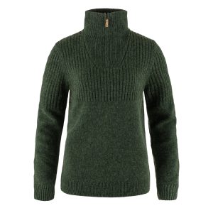 Timeless sweater with a half-length zipper knitted in tuck stitch on the upper chest and sleeves for extra loft and warmth and classic stitch on the lower chest and sleeves. Made from 100% traceable wool with ribbed collar. cuffs and hem. Articulated elbow patches in G-1000 Stretch and classic leather fox logo on sleeve. Perfect for hiking or working outdoors!