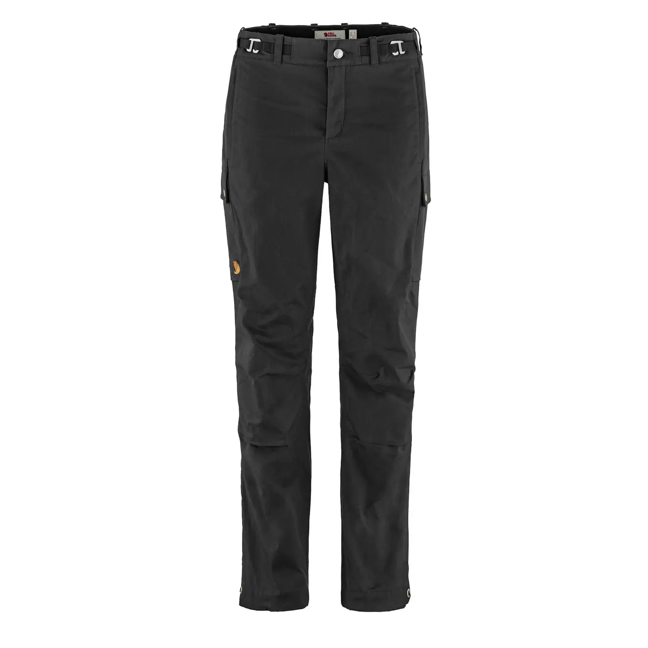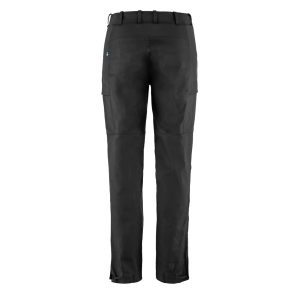 Fjällräven G-1000 trousers with a new design. Regular fit with seat and thigh areas roomy enough for base layers underneath and tapered lower legs for reduced bulk and less risk of wear and tear. The seams use a reduced seam allowance and a 4mm topstitch for less bulk on the inside. Made from G-1000 Stretch Eco with extra stretch panels at the sides and back yoke for great freedom of movement and comfort that adapts to body shape. Zippered hand pockets and leg pockets with bellows and low-profile flaps. Articulated knees with no visible seam allowances to reduce chafing and openings for kneepads. Adjustable leg endings reinforced with stretchy nylon fabric with webbing adjuster in metal and boot hooks. Integrated. detachable and adjustable webbing belt.