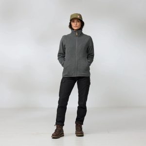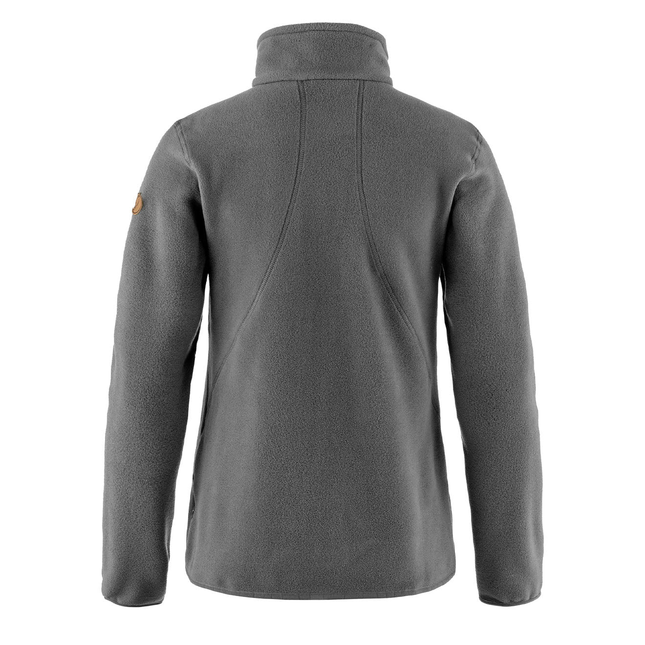 The Fjallraven Womens Stina Fleece in Dark Grey offers a soft. comfortable fit crafted from recycled polyester with a subtle marbled texture. Ideal for mountain hikes or as a warm mid-layer beneath a shell jacket. it also functions well worn alone over a shirt on cool summer evenings. Produced using an eco-conscious method that spins and dyes the thread simultaneously. this fleece reduces water usage by around 50% and energy consumption by 31% compared to traditional manufacturing. Features include a high collar to shield against cold winds. a fleece flap protecting the chin from the zipper. two roomy zippered side pockets. and natural-toned leather zipper flaps.