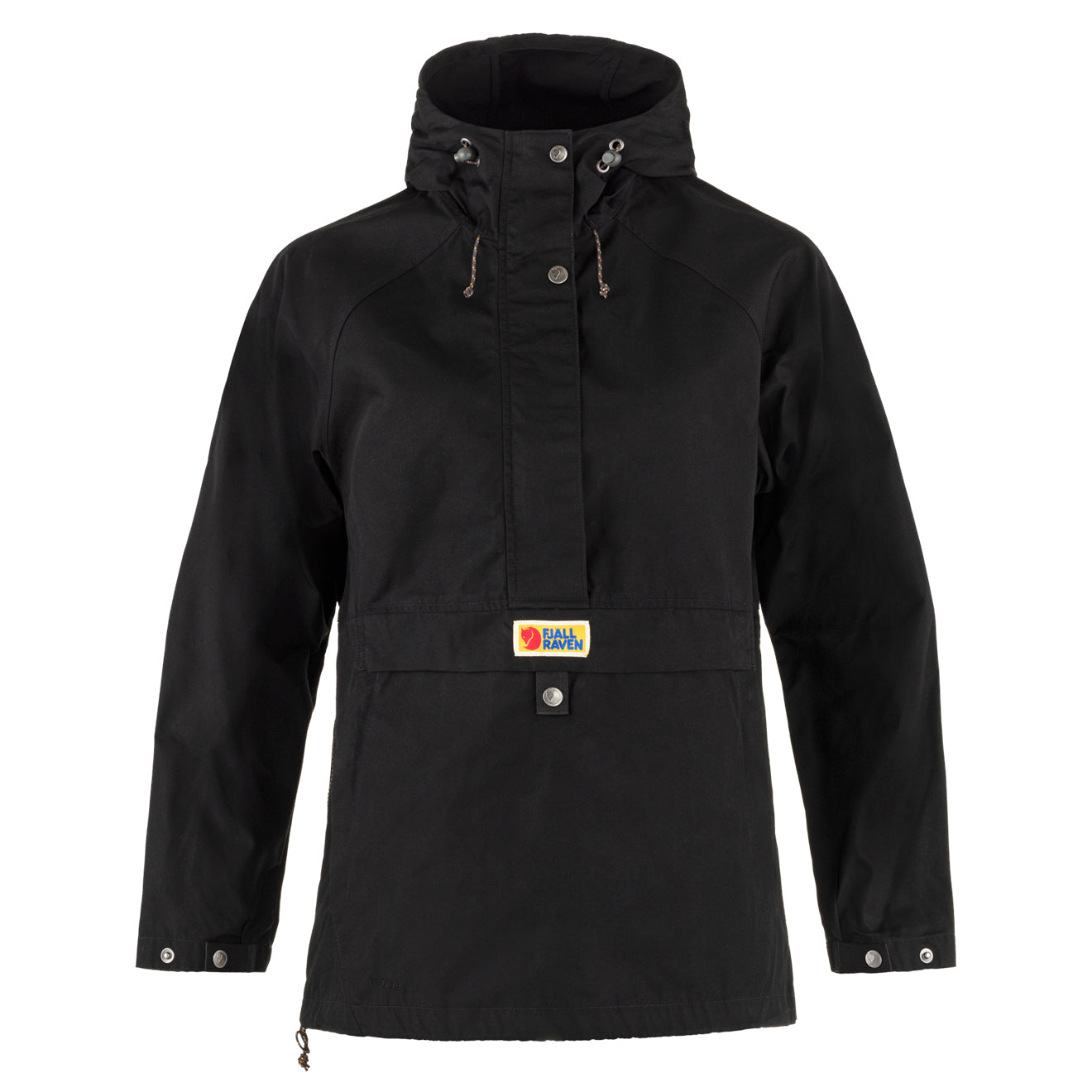 The Fjallraven Womens Vardag Anorak in Black. is a classic style with Vardag Anorak made from durable. weather-resistant G-1000 Eco. The design is simple with adjustable hood. kangaroo pocket and hand pockets. Its loose fit combined with a long front zipper and a side zipper makes it easy to pull on/take off and wear with other layers. A timeless. long-lasting garment for hiking. daytrips and everyday use. all year round.