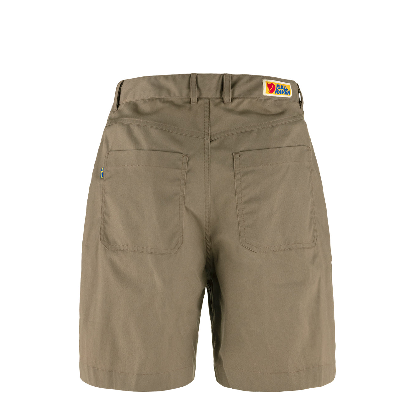 Fjallraven Womens Vardag Shorts in Suede Brown. Comfortable. durable shorts in G-1000 Stretch made from recycled polyester and organic cotton – Vardag Shorts W offer practical shorts for everyday use. They have a high waistline and flattering silhouette with wide leg openings for a more comfortable fit. The length of the legs can be adjusted by rolling the hems up and holding them in place with buttoned straps at the sides. The shorts have pleats at the front. open hand pockets and two open back pockets.